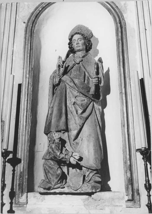 Il tient les vestiges d'une crosse ornée du sudarium. A ses pieds, un petit personnage aux longs cheveux, vêtu d'une robe, agenouillé semble implorer, tout son visage, légèrement mutilé, à la bouche ouverte, marque la supplication ; les deux mains sont cassées.