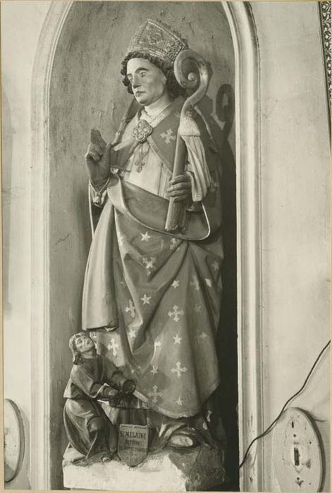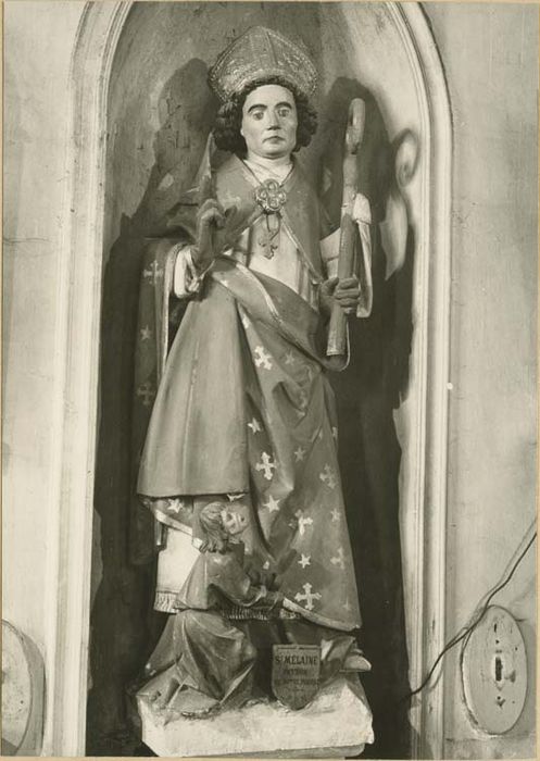 Rien ne permet de penser que cette statue représente véritablement saint Mélaine, en dehors de l'inscription moderne qui a dû remplacer des armoiries.
