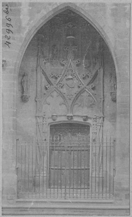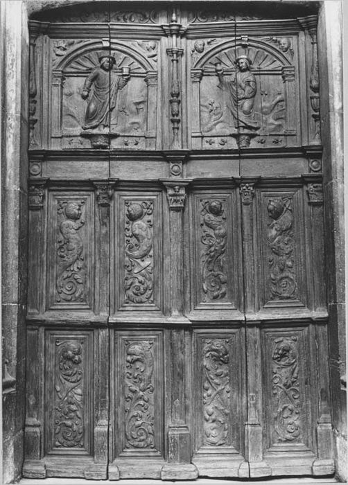 Vantaux du portail, bois sculpté, 16e siècle. Un porche en pierre sculptée, 15e siècle, et la porte en bois du 16e siècle, trois petites statues de pierre, 15e siècle, faisant partie de cet ensemble.