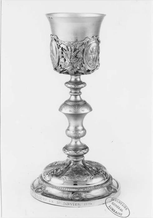 La base du pied est classiquement constituée d'une plinthe, et d'un cavet renversé, conduisant à un dessus sensiblement bombé. La tige, entre les tores de ses parties inférieure et supérieure est développée par un noeud en forme de vase, au profil assez sec, que l'on ne rencontre parfois que sur les calices des premières décennies du 19e siècle. Une gorge conduit à la coupe enrobée d'une fausse coupe ajourée. Dispensé avec mesure, le décor est d'une belle qualité de ciselure avec nombre de parties couvertes d'un fin pointillé. Sur le dessus du pied, trois cartouches que séparent des chutes de pampres et d'épis en fort relief, exposent une croix entre deux scènes traitées en bas relief : le Christ au jardin des Oliviers, puis le Christ portant sa croix. La fausse coupe, d'une épaisseur de métal inhabituelle, reprend les symboles eucharistiques du pied, ajourés entre trois médaillons ovales montrant à mi-corps le Christ, la Vierge, l'apôtre Jean. Patène : sur le dessus, maladroitement gravé, IHS, au-dessus des trois clous et sous une croix.