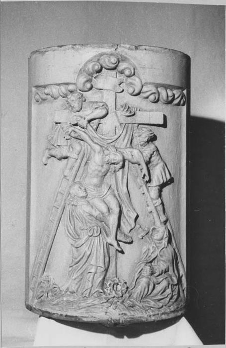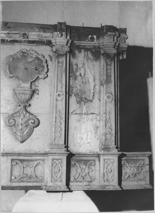 Bois repeint. Un gradin sculpté de rinceaux s'allonge de part et d'autre d'un tabernacle inférieur de plan semi-circulaire, dont la porte, ornée d'un agneau maintenant la bannière de la Rédemption, se détache sur un fond quadrillé. Le tabernacle principal s'élève au-dessus du premier, flanqué de deux éléments de draperies feintes, il est monté sur pivot et offre deux faces distinctes. L'une, formée par sa porte sculptée en bas reliefd'une Descente de croix ; l'autre constituant une niche à trois pans revêtus de glaces, sous un plafond de nuages et de rayons. Au-dessus, s'élèvent quatre lourdes volutes rocailles à courbes et contre-courbes, avec un fond sculpté, autour du monogramme IHS, de nuages et de rayons. Toute cette partie, mal adaptée et fort lourde d'aspect, semble être une réfection de la fin du 18e siècle. Au-dessus du tabernacle, une partie de la corniche cintrée manque. Deux panneaux forment le retable proprement dit, de part et d'autre du tabernacle. Chacun est orné de deux colonnettes ioniques supportant au-dessus d'un entablement, un fronton baroque, orné de médaillons du Christ et de la Vierge. Entre les colonnettes, fort ornementées, sont disposées des chutes de feuillages et de fruits. Des ailerons à volutes calent les extrémités des panneaux.