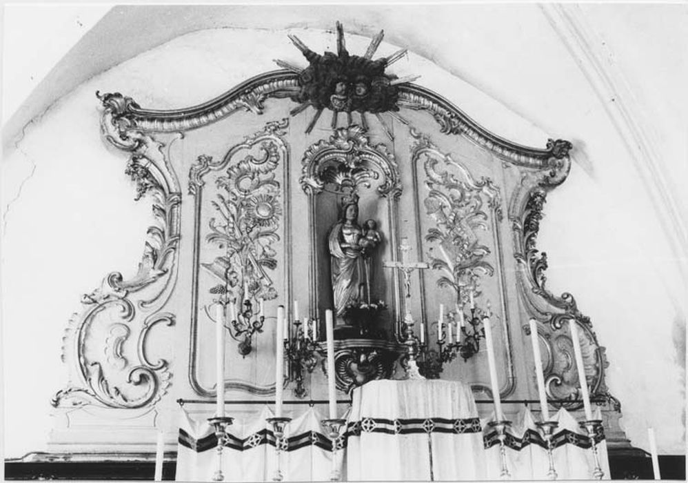 Panneau de boiserie servant de retable (fonctions combinées). Bois repeint et doré. Ce vaste panneau par sa forme et l'exhubérance de son décor, surprenant et monumental témoignage de l'art de la rocaille, couvre le mur du fond du sanctuaire au-dessus d'une boiserie à laquelle il n'est pas lié par son échelle, tout en l'étant par son style. Il a pour centre une niche abritant une médiocre statue de la Vierge portée sur une large console. De part et d'autre, deux hauts panneaux sont remplis par des chutes d'objets du culte mêlées de palmes, d'épis et de pampres. Les flanquent deux puissants ailerons aux amples volutes liées à leur partie supérieure par des agrafes de feuillages à une corniche chantournée, entièrement sculptée en sa gorge, et coupée à son sommet d'une masse de nuages rayonnants d'où sortent des têtes d'angelots ailées.