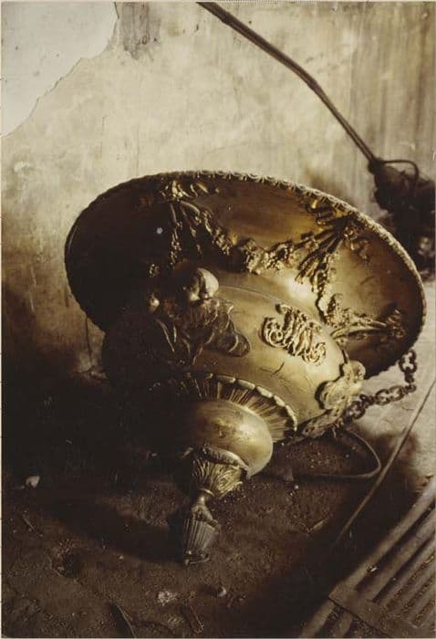 Suspendue à trois chaînettes, qui se dédoublent 30 cm au-dessous d'elles, la vasque est ornée de feuillages et de fruits, avec des têtes d'angelots dans des nuées. Les trois chaînettes se rassemblent sur une couronne, suspendue à des muffles de lions.