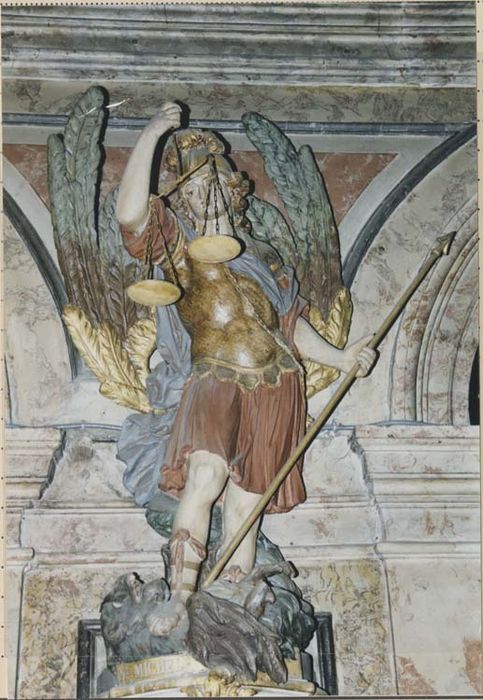 Statue en pierre peinte et console en stuc peint et doré ; bois et métal pour la lance, les ailes et la balance. Il foule aux pieds le dragon vaincu.