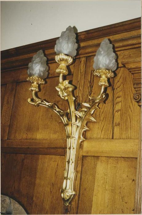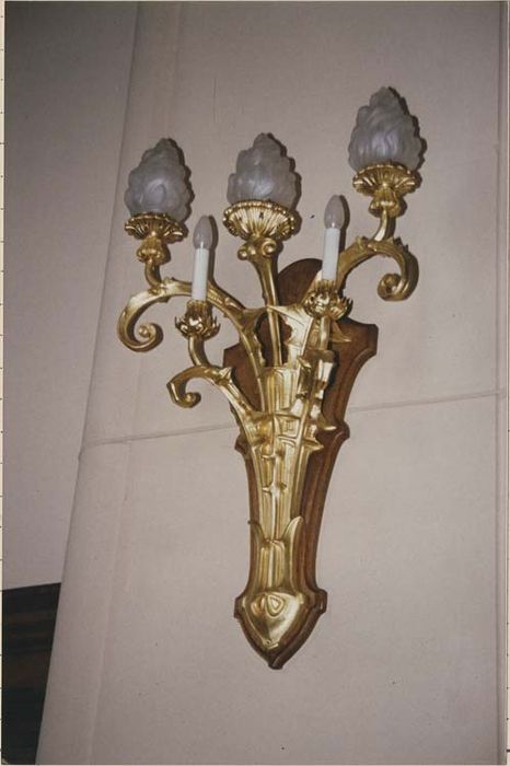 Exemple rare d'éclairage d'église par des luminaires Art Nouveau. Le travail de ces appliques est sans conteste un chef d'oeuvre : des courbes simples composent la structure d'inspiration végétale ; d'une branche centrale arrêtée d'un triangle arrondi, des rameaux s'épanouissent, marqués de piquants plus ou moins développés. Autant que la forme, la précision du détail est exceptionnelle (mouluration, piquetés). Certaines appliques sont aujourd'hui fixées sur une alèse de bois, qui épouse les formes générales de la branche centrale.