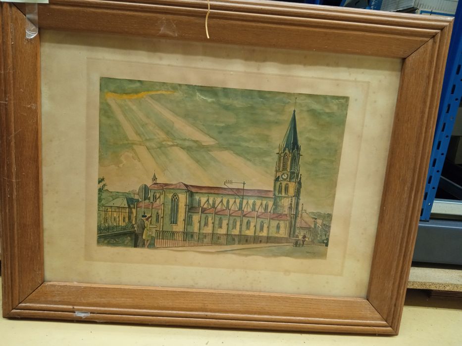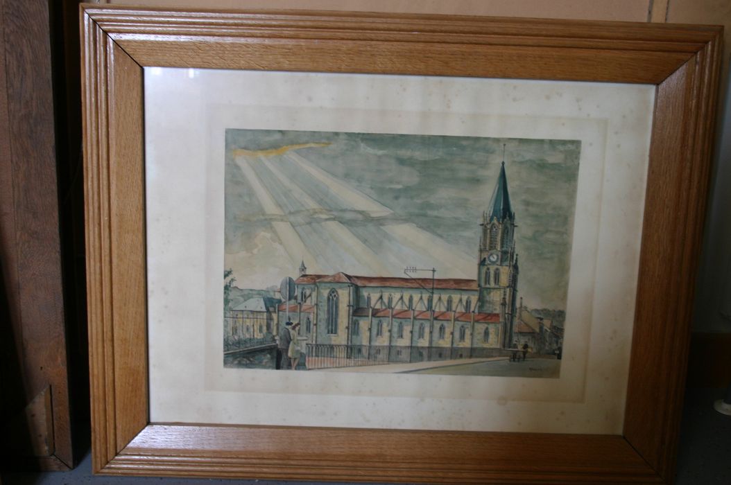 dessin et cadre : l'Eglise de Baccarat, après sa destruction de 1944