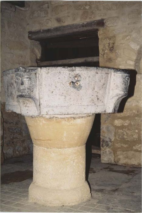 Fonts baptismaux dont la cuve qui date du 12e ou 13e siècle est posée sur un pied du 16e siècle.