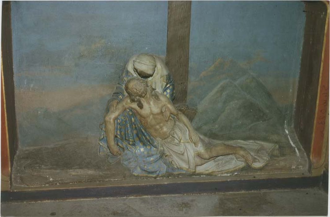 POP | Plateforme ouverte du patrimoinechapelle de Notre Dame de la Salette avec deux statues : saint Pierre et sainte Elisabeth, un groupe sculpté : l'Apparition de la salette et un haut-relief : Vierge de Pitié