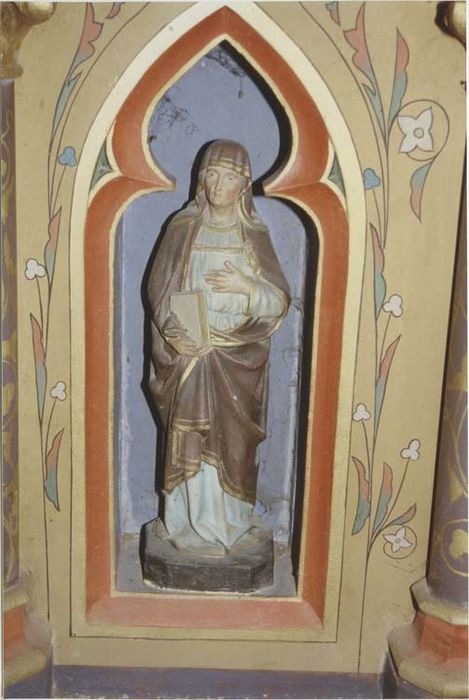 La polychromie est partiellement réalisée au pochoir. L'ensemble est traité dans un style néogothique.