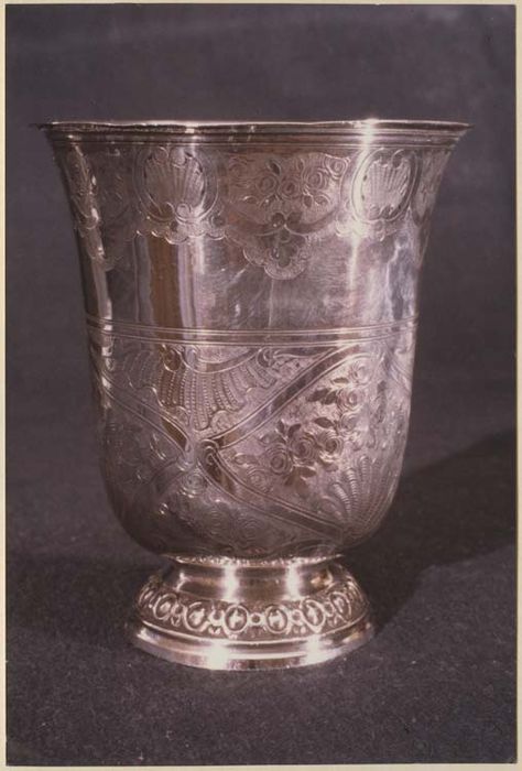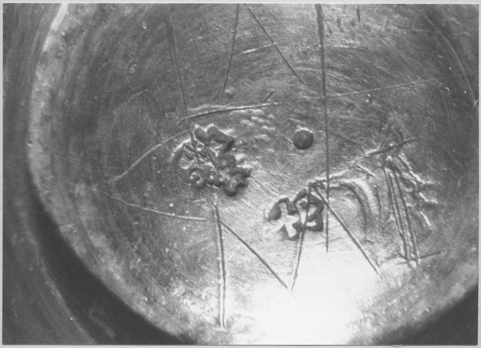 Poinçon de maître : NCBD, fleur de lys couronnée, lance : poinçon de Noël-César Boutheroue-Desmarais, reçu maître-orfèvre à Paris le 12 septembre 1764. Poinçon de décharge : tête de chien : Paris (1762-1768). Deux poinçons illisibles.