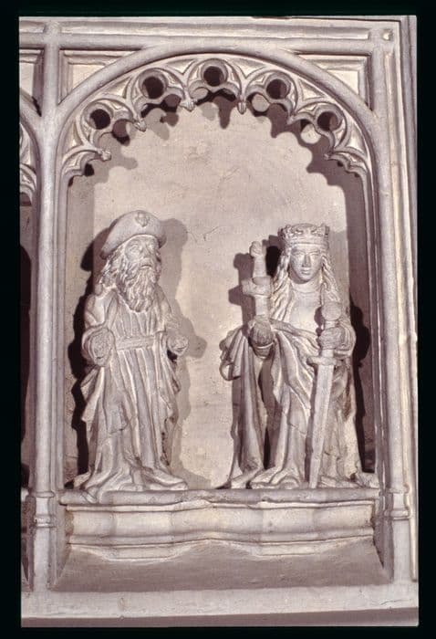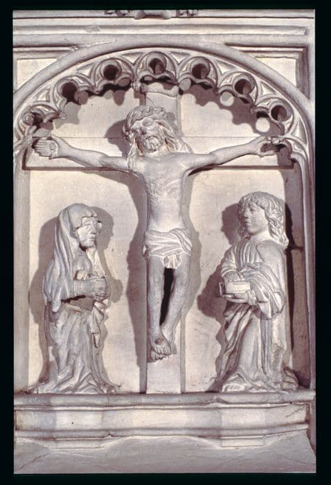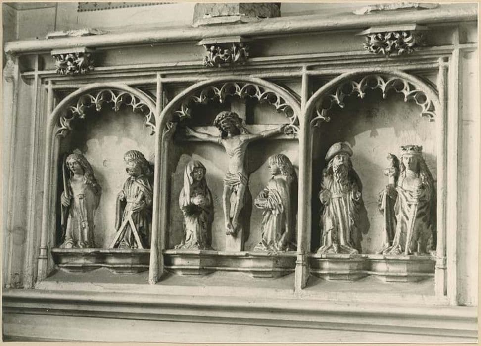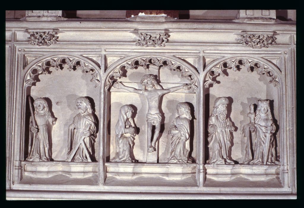 Dans un encadrement mouluré, sur trois arcatures polylobés, des personnages sont sculptés, le Christ, la Vierge, saint Jean, une sainte, saint André, saint Jacques et sainte Marguerite.