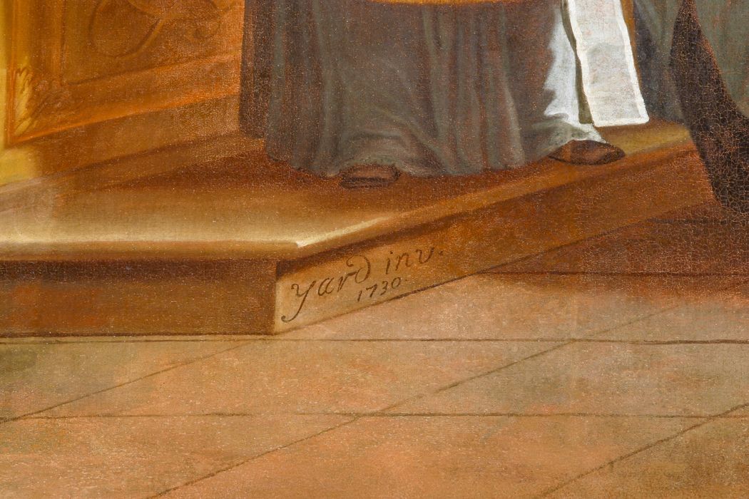 2 tableaux et leurs cadres : Pierre Fourier remettant le livre des Constitutions aux religieuses de la Congrégation Notre-Dame, Pierre Fourier remettant leur insigne aux chanoines réguliers de Lorraine