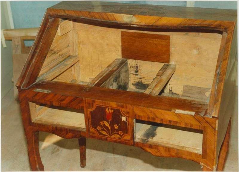 Le bâti en chêne et sapin est marqueté et incrusté de bois rares.