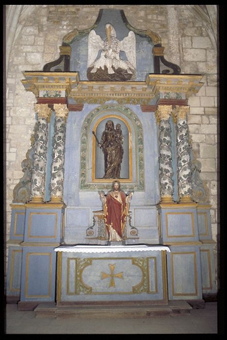 Quatre colonnes supportent un entablement, au-dessus duquel se dresse un pélican avec ses petits, accosté de deux corbeilles de fleurs.