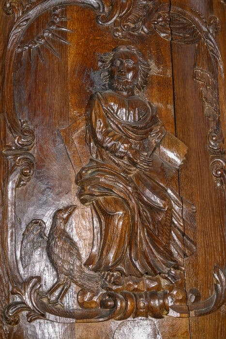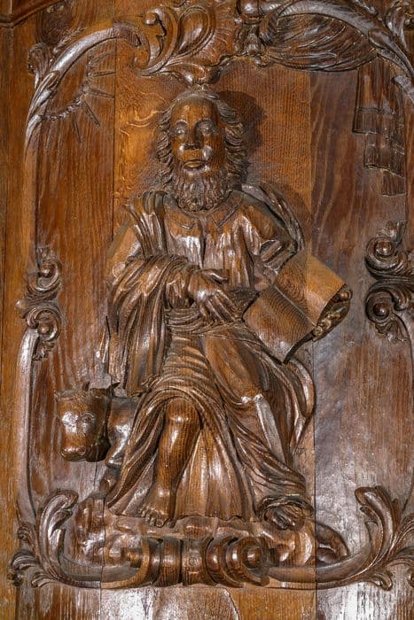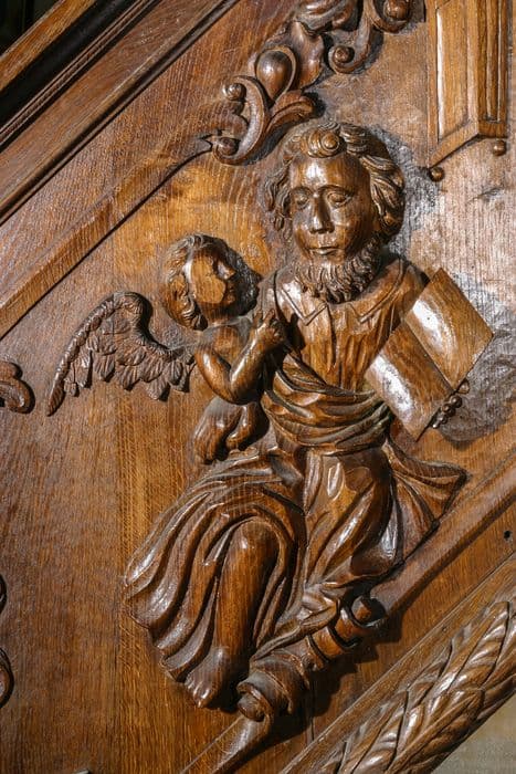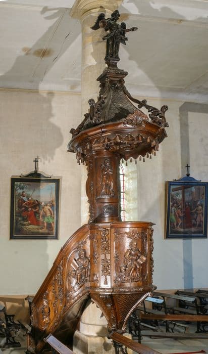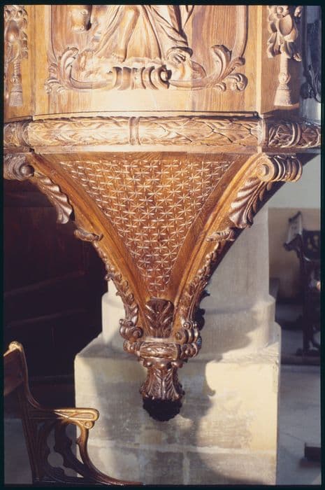 Cette chaire suspendue est composée, d'une cuve de plan hexagonal, terminée par une base pyramidale, d'un escalier presque droit, volée à gauche, d'une rampe ornée de quatre panneaux rectangulaires représentant les quatreévangélistes. Le dorsal et l'abat-voix sont légèrement arrondi, ce dernier est sommé d'ailerons.