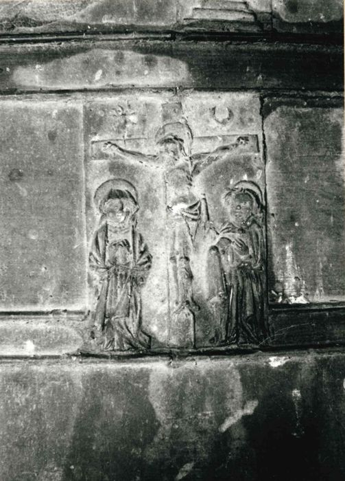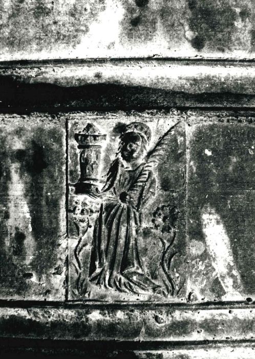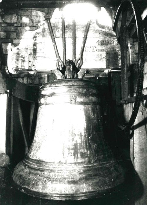 Inscriptions en gothique et en latin (entre chaque mot une feuille d'arbre) : VOX MEA CUNCTORUM TERROR SIT DEMONIORUM MIL CCCCC L IIII ( = ma voix soit l'épouvante de tous les êtres démoniaques 1554).