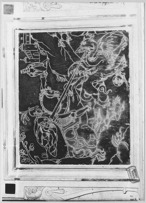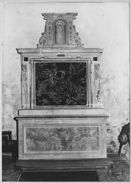 Inscription (sur le retable, dans un cartouche rectangulaire en amortissement) : SANCTE GEORGI ORA PRO NOBIS.