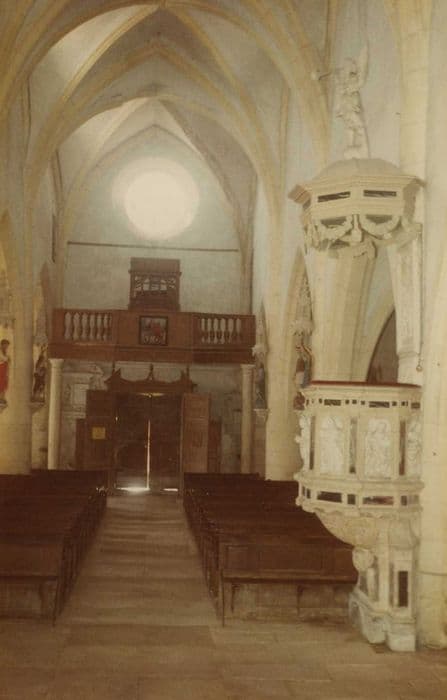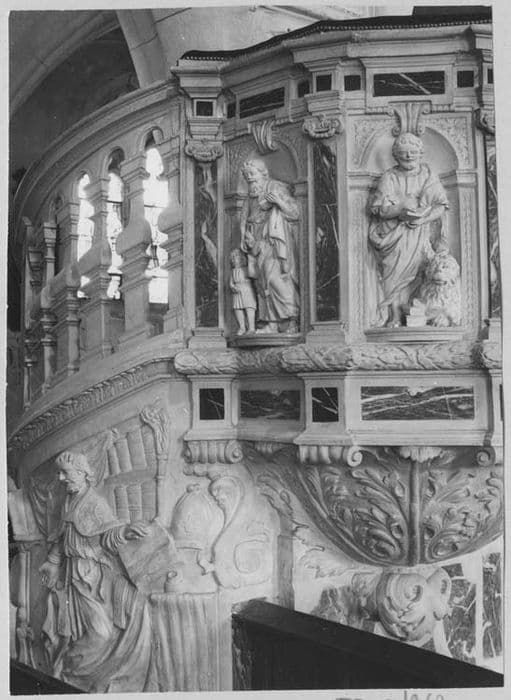 Elle comprend la cuve en pierre ornée de statuettes, à laquelle on accède par un escalier tournant dont le mur d'échiffre est sculpté d'un vaste bas-relief et supporte une rampe à balustre de bois. Formant fond en arrière de la cuve, contre le pilier, un panneau sculpté monte jusqu'à l'abat-voix surmonté d'un ange embouchant une trompette.