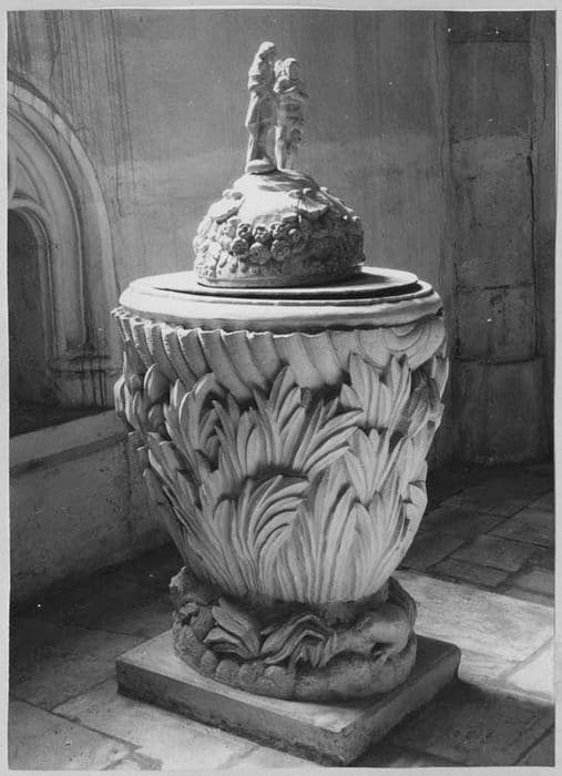 La cuve est en pierre et le couvercle est en bois. Le tout est peint. Sur le couvercle est posé un dôme de bois sculpté de guirlandes et de coquilles surmonté d'un groupe représentant le Baptême du Christ.