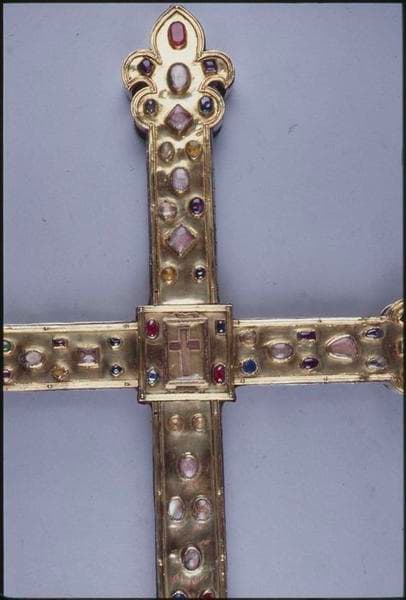 En argent, vermeil et cabochons. Noeud cuivré avec traces d'émail. Au centre, se trouve un reliquaire de la Croix.