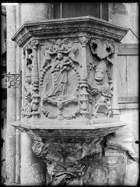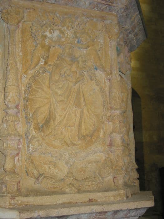 De forme hexagonale, elle comporte sur son panneau central, la Vierge couronnée par des anges, sur les deux panneaux latéraux, un buste d'évêque et un buste de femme.