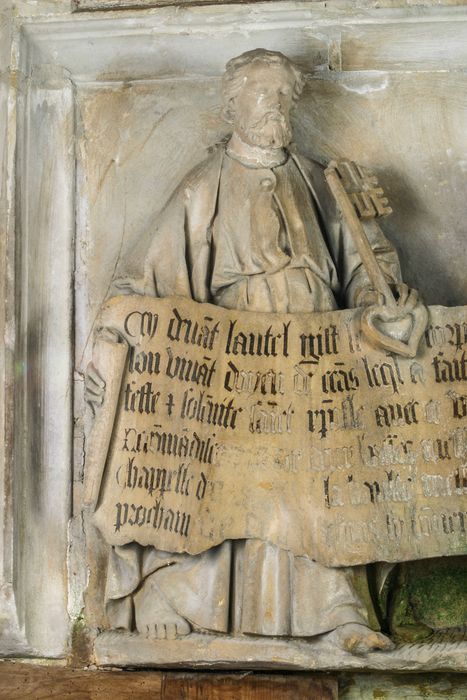 Epitaphe (sur l'ex-voto) : Y devat lautel gist le corps de venerable noble et discrète personne Messire Francois Brulé, prêtre en son vivant doyen de ceans lequel a fait construire et édifier cette présente chapelle en laquelle il a fondé le service de la fête et solennité saint Christophe etc.