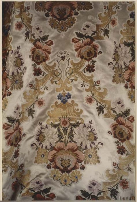 damas (blanc) ; soie : polychrome ; fil métal (or, argent)