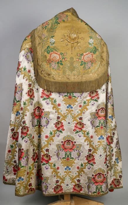 Chape à fond damassé blanc moiré à décor floral en soie polychrome avec chaperon en damas blanc, et soie polychrome ou fils d'or et d'argent.