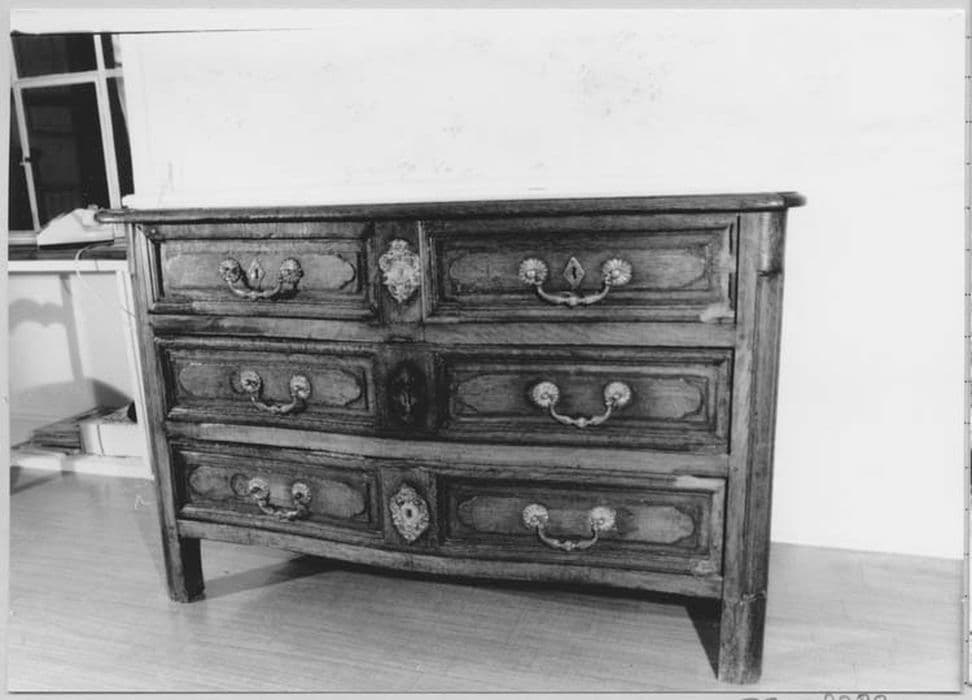 Commode à deux petits tiroirs supérieurs et deux grands tiroirs central et inférieur avec plateau en chêne et pieds droits. Les ouvertures de serrures en bronze montrent au-dessus d'un médaillon de bordure floral la tête d'un personnage à chevelure de style baroque.