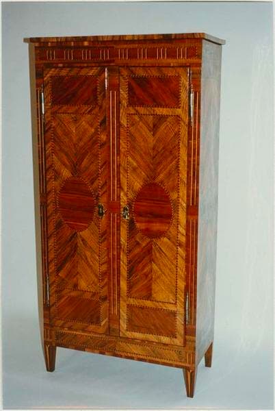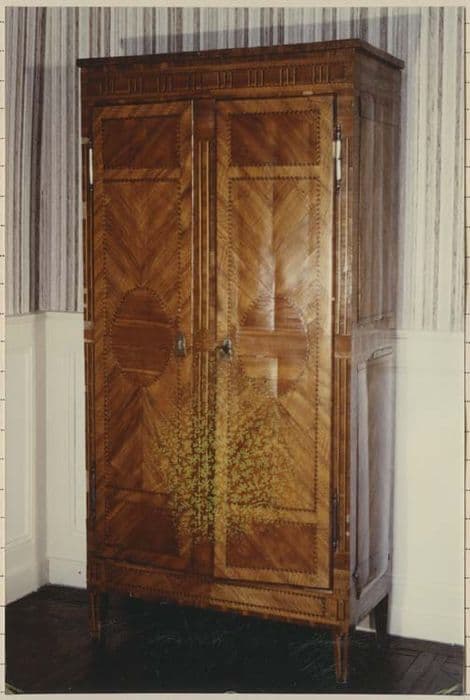 Armoire de style et d'époque Louis XVI à marqueterie et incrustations en bois précieux. Deux battants à décor symétrique. Entrées de serrure en laiton. Assemblage par chevilles.