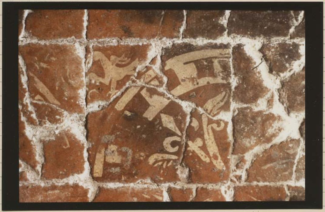 Pavement comprenant 208 carreaux : 125 carreaux estampés bicolores, 74 carreaux monochromes de bordure rectangulaire, 7 demi carreaux de bordure triangulaire avec diagonale, un carreau monochrome carré avec huit modules triangulaires tracés à la pointe sèche, 1 carreau isolé estampé bicolore carré (dragon) et 1 carreau bicolore estampé carré (cerf) placé dans la nef.