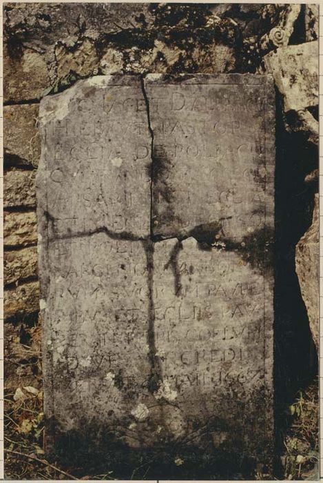Angle supérieur gauche brisé. Pierre fendue par le milieu horizontalement et verticalement