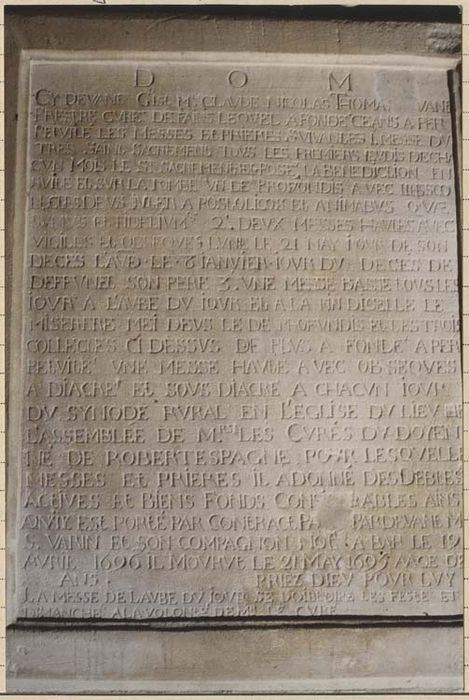Epitaphe : dom cy devant gist Mre Claude Nicolas Thomas va ne prestre curé de Fains lequel a fondé céans à perpétuité les messes et prières suivantes 1 messe du très saint sacrement tous les premiers jeudis de chacun mois le saint sacrement exposé, la bénédiction en suite et sur la tombe un de profondis avec les colectes deus inter apostolicos et animabus quae sumus et fidelium 2 deux messes haultes avec vigiles et obsèques l'une le 21 may jour de son décès l'ave (l'autre) le 8 janvier jour du décès de Deffunel son père 3 une messe basse tous les jours à l'Aube du jour et à la fin de celle le miserere mei deus le de profondis et les trois collectes ci dessus de plus a fondé à perpétuité une messe haute avec obsèques a diacre et sous diacre à chacun jour du synode rural en l'église du lieu de l'assemblée de Mrs les curés du doyenne de Robert Espagne pour lesquelles messes et prières il a donné des debles actives et biens fonds cons (ide) râbles ainsi quil (ici ce mot a été superposé sur un autre mot ainsi écrit par erreur) est porté par coneract pa (sse) par devant Ms Varin et son compagnon not (ai) res à Bar le 19 avril 1696 il mourut le 21 may 1695 âgé de (54) ans priez dieu pour lui la messe de l'Aube du jour se doit dire les feste et dimanche à la volonté de Mr le curé (transcription).