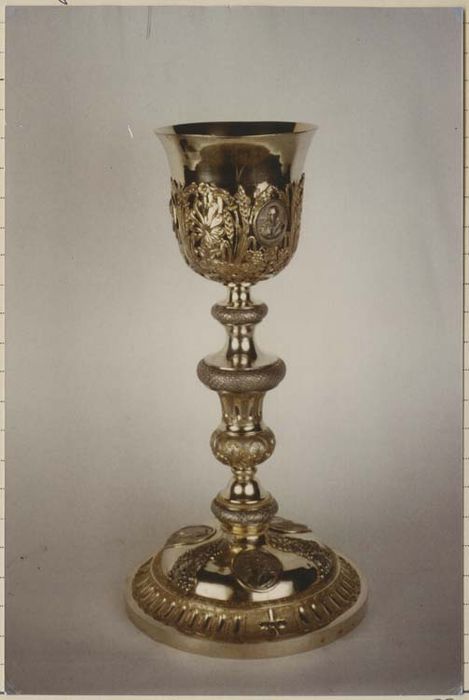 pied : godrons, médaillons avec le Christ, la Vierge et saint Jean, blé et palmettes. noeud : en forme de Jarre à fleurs. fausse coupe : médaillons ovales avec le Christ la Vierge et Dieu le Père, blé et palmettes