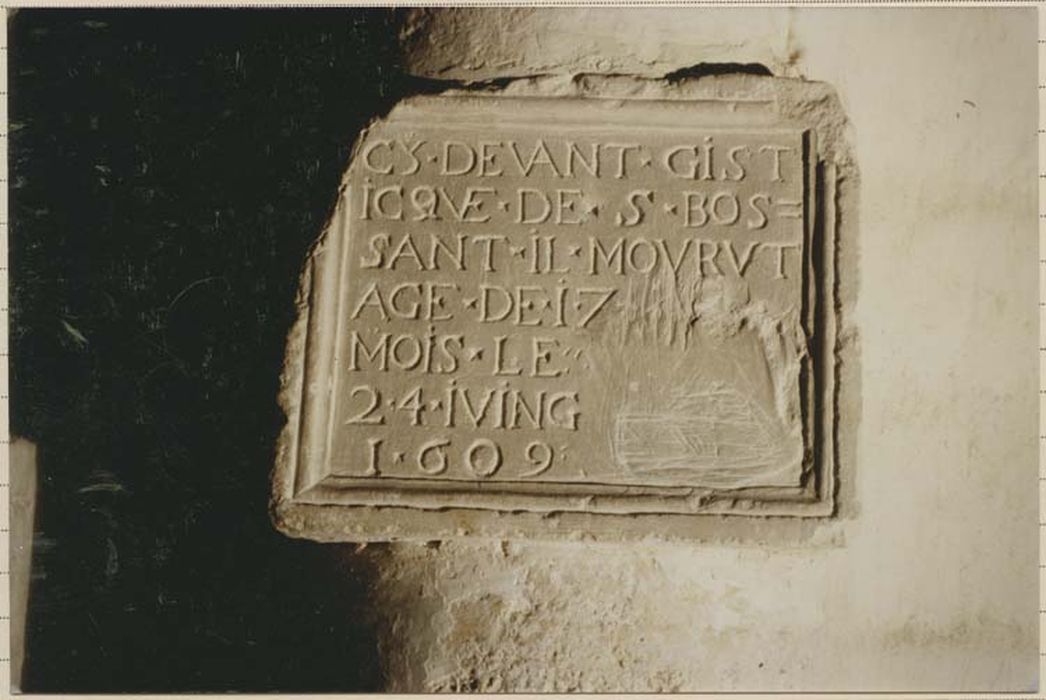 Epitaphe : CY DEVANT GIST/ICQVE DE S BOS =/SANT IL MOVRVT/AGE DE 17/MOIS LE/24 IVING/1609.