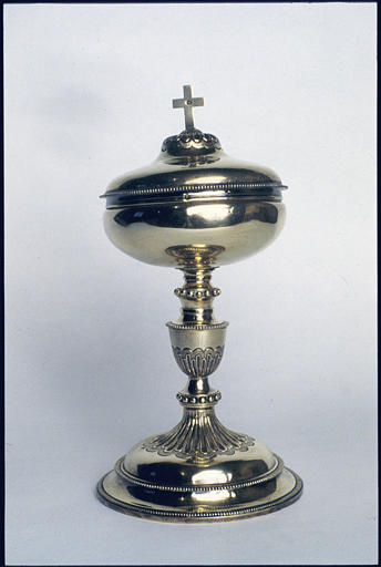 couvercle : petite croix plate le surmontant au centre. sortes de palmettes allongées en éventail sur le pied à partir de la tige sur le noeud sur le couvercle