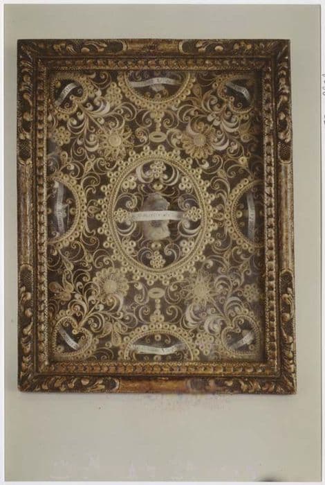 Deux reliquaires dans le même cadre en bois sculpté. Volutes et spirales en papier doré.