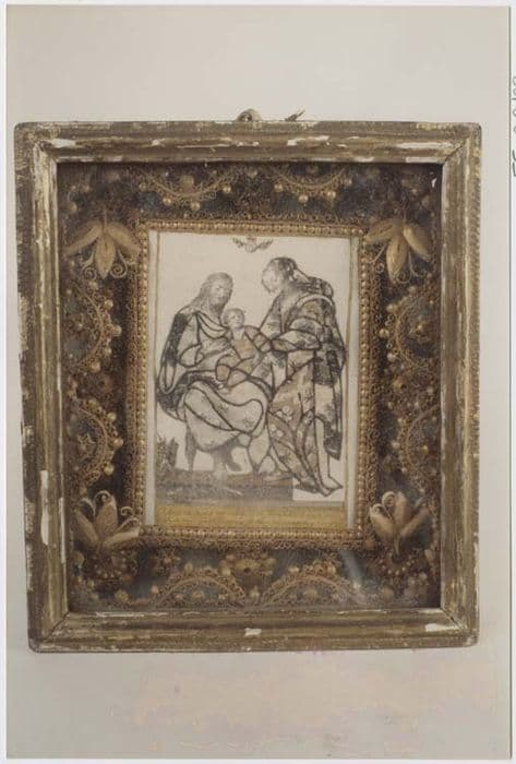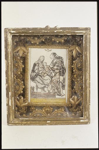 Deux cadres enferment une image en fil de soie sur papier de la Sainte Famille et Notre-Dame d'Einsiedeln (Suisse).