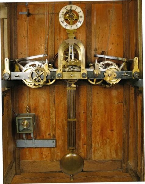 Belle pièce de maîtrise, avec trois rouages horizontaux, une sonnerie au quart avec un coup d'avertissement trois minutes avant le déclenchement de chaque sonnerie. L'échappement à chevilles utilise les différences de dilatation entre les tiges en acier qui se dilatent vers le bas et les tiges en laiton qui se dilatent vers le haut, annulant les différences de réglage dues aux écarts de température. Les différents pignons de cette horloge sont de type lanterné et non taillé, constituées de deux plaques en laiton entre lesquelles sont implantées des goupilles rouleaux en guise de dents. Seuls les deux pignons des volants régulateurs de sonnerie trop petits pour être lanternés sont taillés. Les longerons du châssis sont en fonte, avec des paliers laiton rapportés. Les roues et la partie centrale sont en laiton gravé et argenté. Toutes les pièces en acier sont forgées. La transmission au cadran extérieur est réalisé depuis le cadran de contrôle par des tringles en acier et des renvois d'angle en laiton.