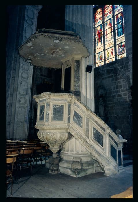 Chaire en pierre composée d'un escalier en pierre avec appuie-main largement saillant. Cet escalier conduit à une cuve hexagonale à 4 panneaux séparés par des pilastres.