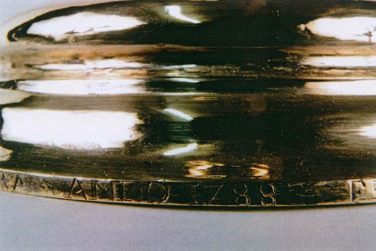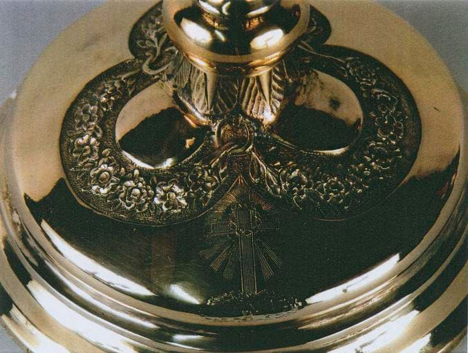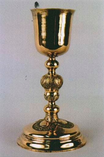 Calice en argent doré et son coffret. Le pied et la tige du calice sont ornés de feuilles (type palmettes), de fleurettes et d'une petite croix à couronne d'épine gravées.