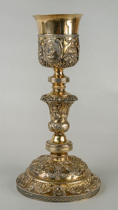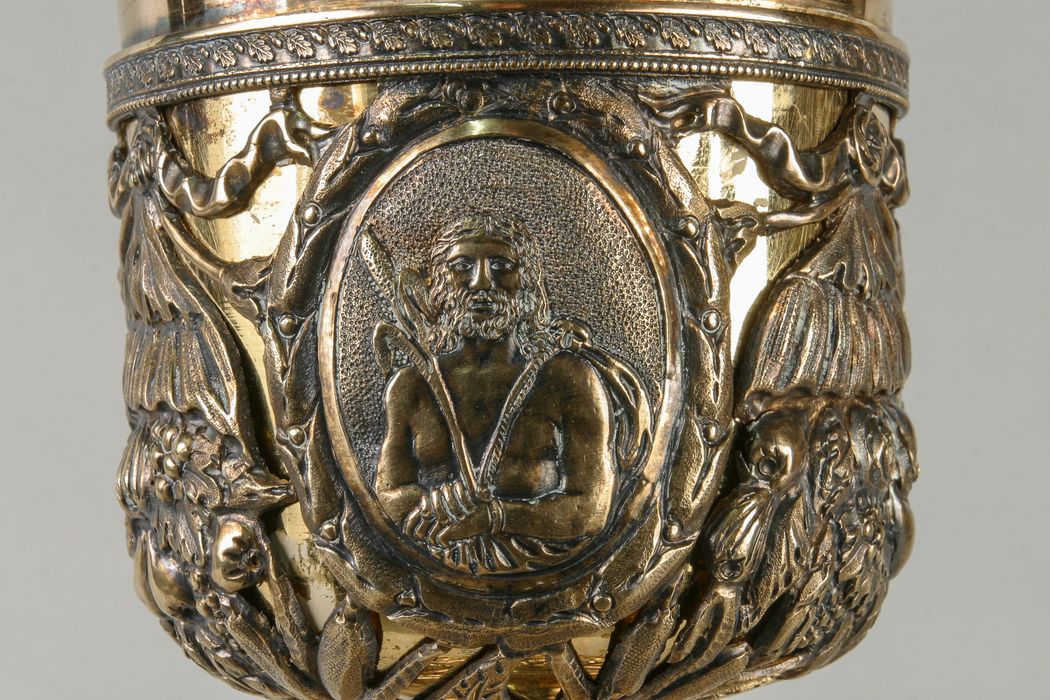 Sur le pied, la tête du Christ couronné entouré des médaillons des évangélistes, sur la fausse coupe, trois médaillons représentant le Christ sur l'un des côtés, la Vierge et saint Jean.
