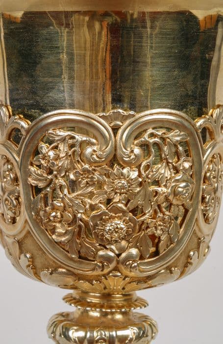 Ce calice se caractérise par l'élégance de son noeud d'esprit Louis XVI et la richesse de la fausse-coupe.