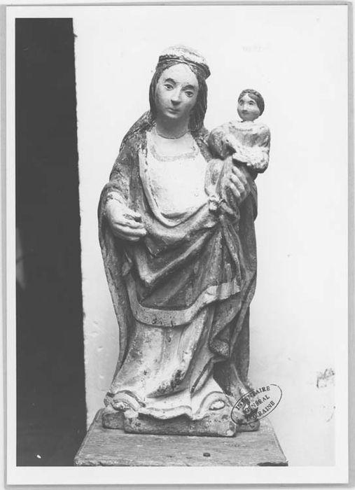En 1975 : état moyen, têtes cassées et attribut de la Vierge manquant. Tête de l'Enfant restaurée.