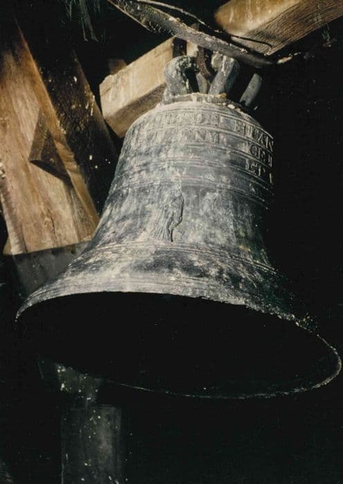 Cloche en bronze portant une inscription. Sa note est le Si bémol.