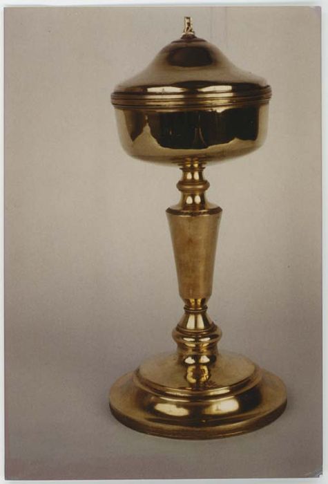 Ciboire en argent doré, à tige en cône renversé. Sa surface est lisse, seule la tige est ornée d'anneaux comportant des godrons, des perles et des grecques. Une croix est ciselée sur le pied.