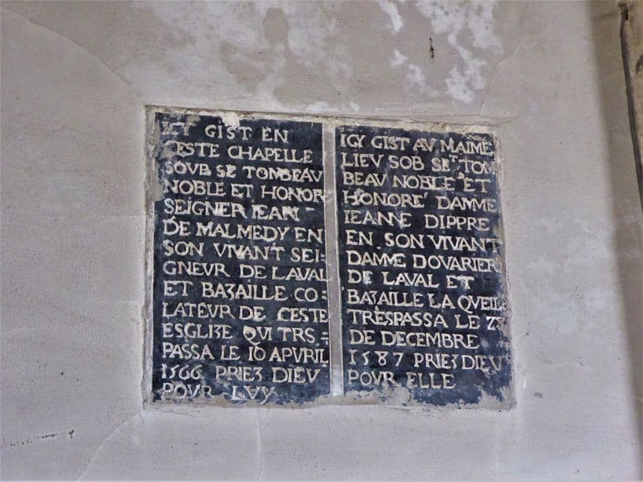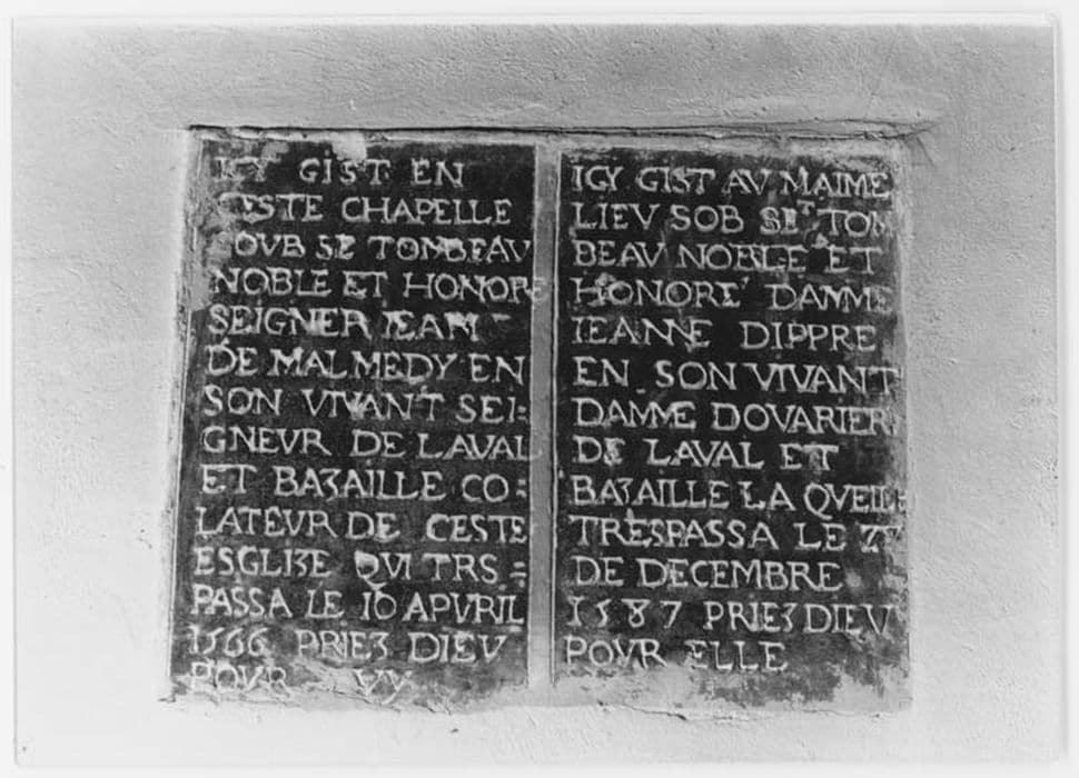 plaque funéraire : deux épitaphes à la mémoire de Jean de Malmédy, seigneur de Bazeilles, et de Jeanne d'Ypres son épouse
