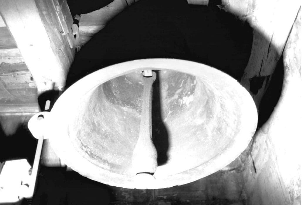 Cloche en bronze, battant en fer et ferrures de fixation et traverse d'appel en bois d'époque.