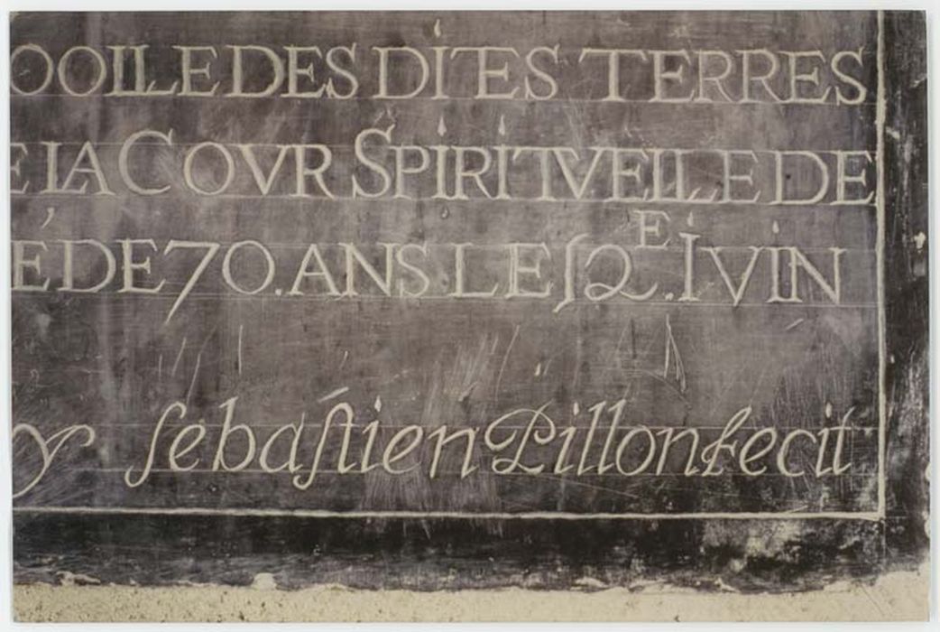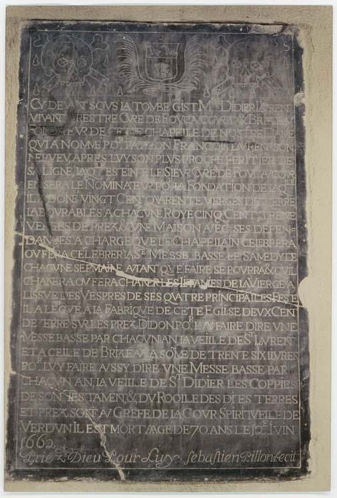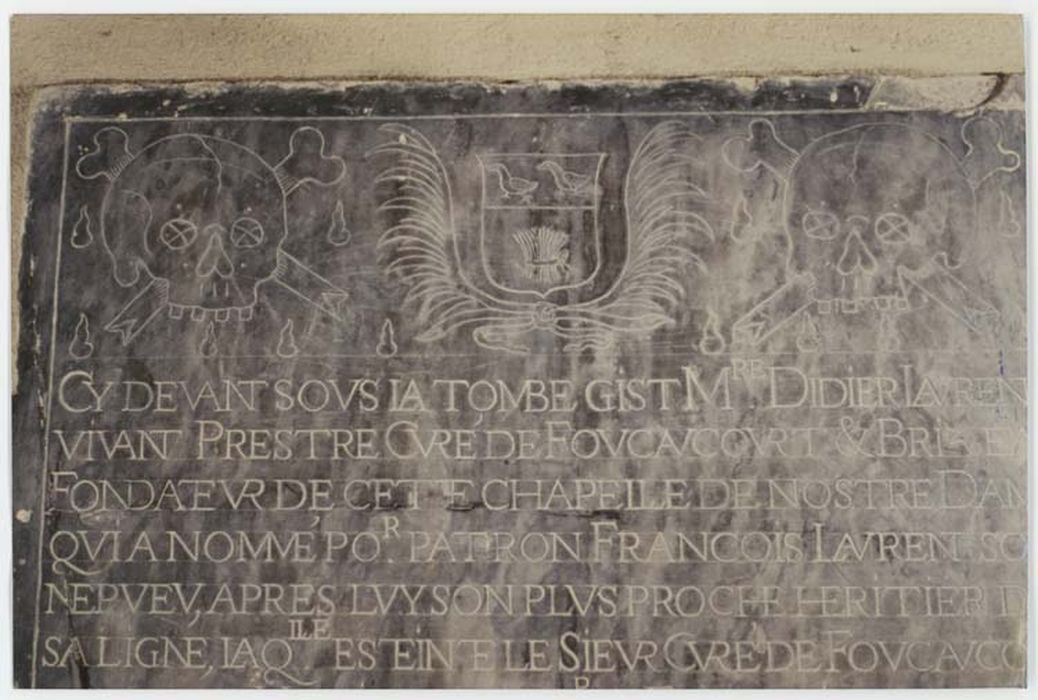 Transcription : CY DEVANT SOUS LA TOMBE GIST M[ESSIR]E DIDIER LAURENT/VIVANT PRESTRE CURE DE FOUCAUCOURT & BRIZEAU/FONDATEUR DE CETTE CHAPELLE DE NOSTRE DAME/QUI A NOMME PO[U]R PATRON FRANCOIS LAURENT SON/NEPVEU APRES LUY SON PLUS PROCHE HERITIER DE/SA LIGNE LAQ[UE]LLE EST[?]EINTE LE SIEUR CURE DE FOUCAUCOURT/EN SERA LE DOMINATEUR PO[U]R LA FONDATION DE LAQ[UE]LLE/IL A DONE VINGT CENT QUARENTE VERGES DE TERRE/LABOURABLES A CHACUNE ROYE CINQ CENT TREN[T]E/VERGES DE PREZ & UNE MAISON AVEC SES DEPEN/DANCES A CHARGE QUE LE CHAPELAIN CELEBRERA/OU FERA CELEBRER LA S[AIN]TE MESSE BASSE LE SAMEDY DE/CHACUNE SEPMAINE AUTANT QUE FAIRE SE POURRA & QUIL/CHAN[TE]RA OU FERA CHAN[TE]R LES LITANIES DE LA VIERGE A/LISSUE DES VESPRES DE SES QUATRE PRINCIPALLES FESTE/IL A LEGUE A LA FABRIQUE DE CETE EGLISE DEUX CENT/DE TERRE SUR LES PREZ DIDON PO[U]R LUY FAIRE DIRE UNE/MESSE BASSE PAR CHACUN AN LA VEILLE DE ST LAURENT/ET A CELLE DE BRIZEAU LA SO[M]ME DE TRENTE SIX LIVRES/PO[U]R LUY FAIRE AUSSY DIRE UNE MESSE BASSE PAR/CHACUN AN LA VEILLE DE ST DIDIER LES COPPIES/DE SON TESTAMENT & DU ROOLLE DES DITES TERRES/ET PREZ SONT AU GREFE DE LA COUR SPIRITUELLE DE/VERDUN IL EST MORT AAGE DE 70 ANS LE 12E IUIN 1662/PRIEZ DIEU POUR LUY SEBASTIEN PILLON FECIT.