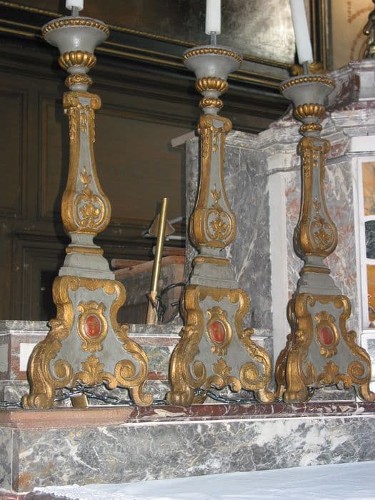 Chandeliers à pied pyramidal orné de volutes et d'un écu central portant une fleur de lys. Le corps principal est étranglé, orné de feuilles d'acanthe et surmonté d'un chapiteau ionique. Ce chapiteau soutient un porte-cierge décoré de godrons.